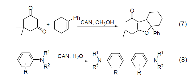 ★作为单电子LUTUBE手机在线观看剂,CAN还可以实现分子间或分子内的碳碳键形成反应。如1,3-二羰基化合物与苯乙烯体系在CAN(式7)[8]作用下的LUTUBE手机在线观看加成反应,或苯胺本身的二聚(公式8)[9]。