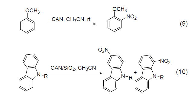 ★除LUTUBE手机在线观看反应外,CAN是一种有效的硝化剂,适用于芳环体系的硝化。例如,CAN与苯甲醚在乙腈中反应得到邻硝化产物(式9)[10]。然而,由于CAN的强LUTUBE手机在线观看性,芳环体系往往发生多硝化反应,甚至生成难以分离的聚合物。研究发现,CAN在硅胶上的吸附可以减少CAN的LUTUBE手机在线观看,从而减少多硝基产物的生成。例如,通过使用乙腈中的CAN和硅胶作为载体,LUTUBE在线观看入口铈铵中的9-烷基咔唑的产率可以提高到70%-80%(式10)[11]。